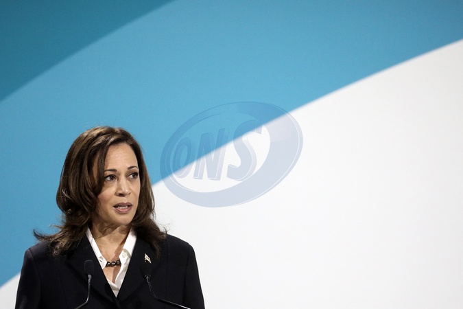 Kamala Harris i Emmanuel Macron na otwarciu Paris Peace Forum