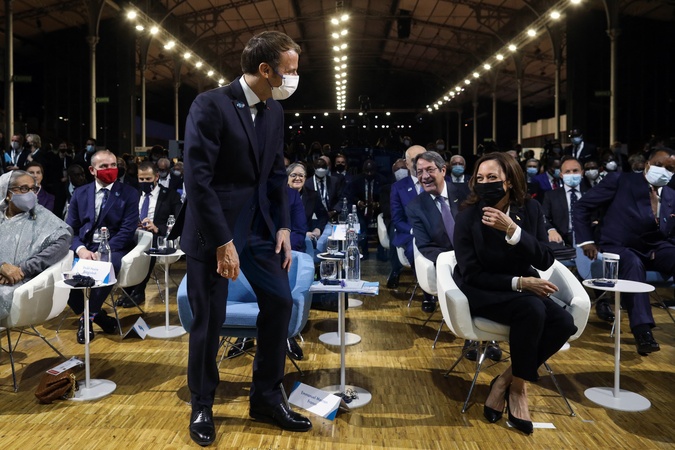 Kamala Harris i Emmanuel Macron na otwarciu Paris Peace Forum