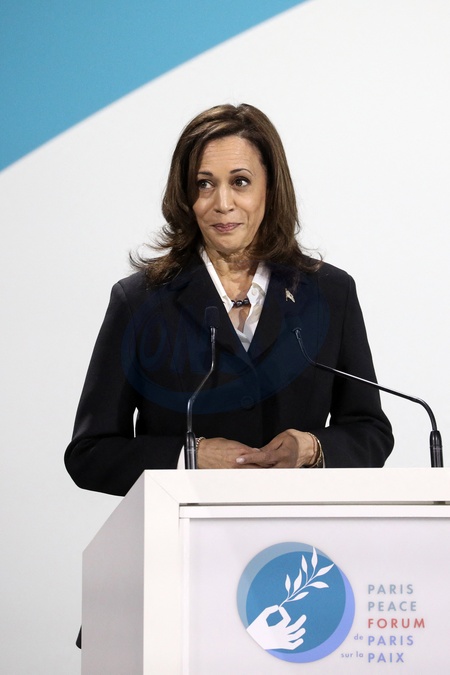 Kamala Harris i Emmanuel Macron na otwarciu Paris Peace Forum
