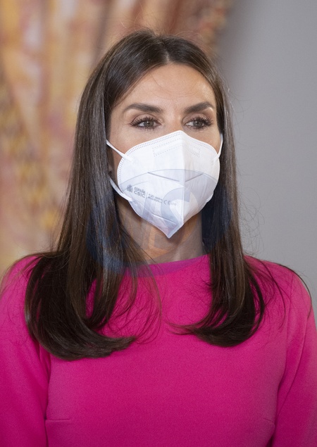 Krolowa Letizia w fuksjowej sukience podczas wizyty prezydenta Angoli