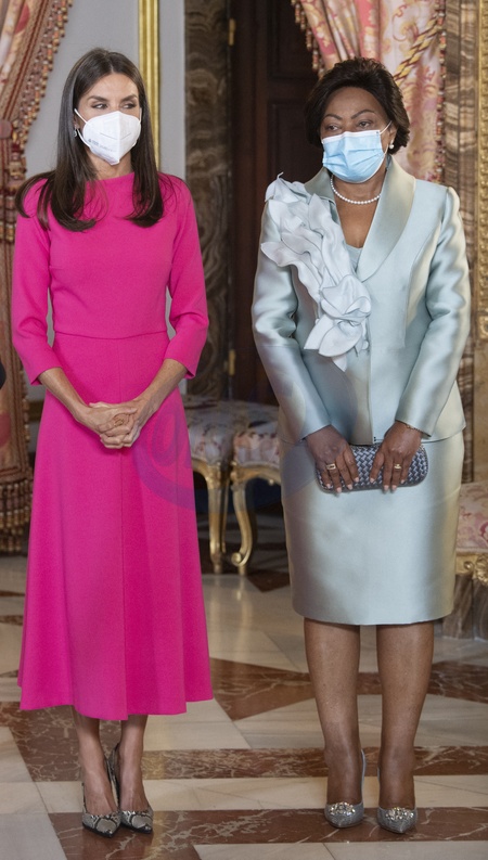 Krolowa Letizia w fuksjowej sukience podczas wizyty prezydenta Angoli