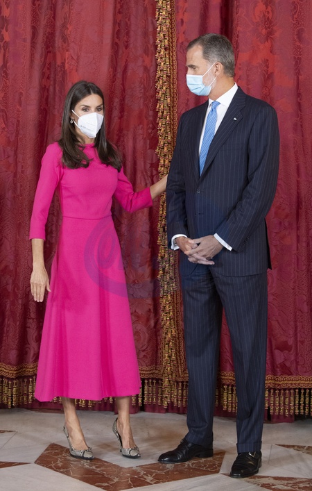 Krolowa Letizia w fuksjowej sukience podczas wizyty prezydenta Angoli