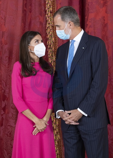 Krolowa Letizia w fuksjowej sukience podczas wizyty prezydenta Angoli
