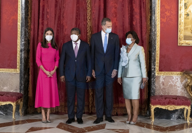 Krolowa Letizia w fuksjowej sukience podczas wizyty prezydenta Angoli