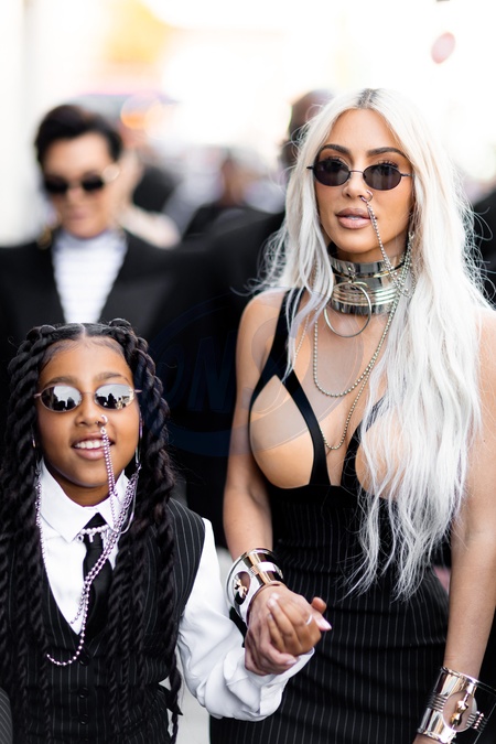 Kim Kardashian z corka North West - obie z kolczykami w nosie na lancuszku
