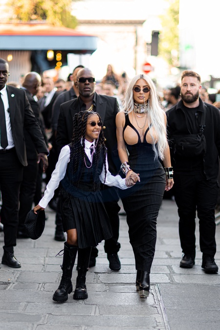 Kim Kardashian z corka North West - obie z kolczykami w nosie na lancuszku
