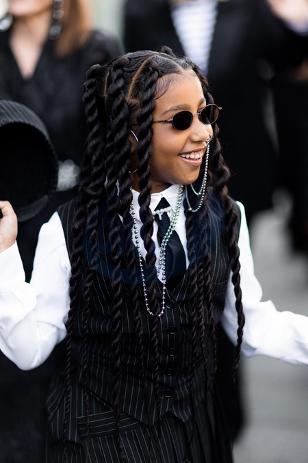 Kim Kardashian z corka North West - obie z kolczykami w nosie na lancuszku