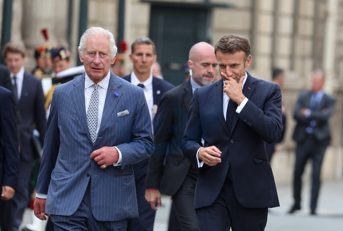 Macron Krol Karol III przed ambasada WB w Paryzu