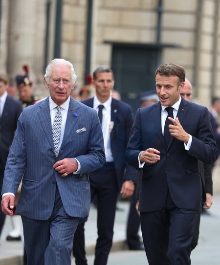 Macron Krol Karol III przed ambasada WB w Paryzu