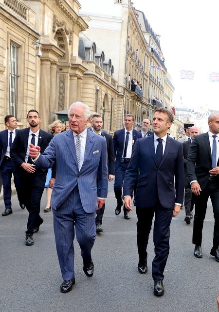 Macron Krol Karol III przed ambasada WB w Paryzu