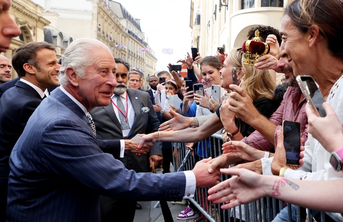 Macron Krol Karol III przed ambasada WB w Paryzu