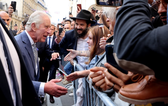 Macron Krol Karol III przed ambasada WB w Paryzu