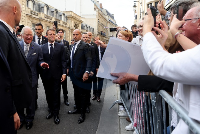 Macron Krol Karol III przed ambasada WB w Paryzu