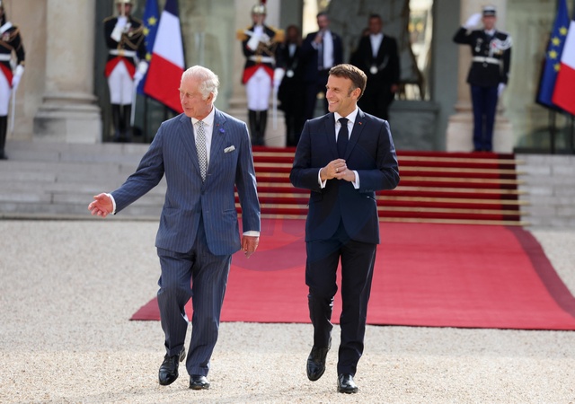 Macron Krol Karol III przed ambasada WB w Paryzu