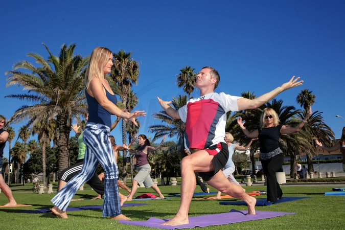 Marek Probosz z zona Malgorzata cwiczy joge. Malgosia prowadzi szkole jogi w Los Angeles