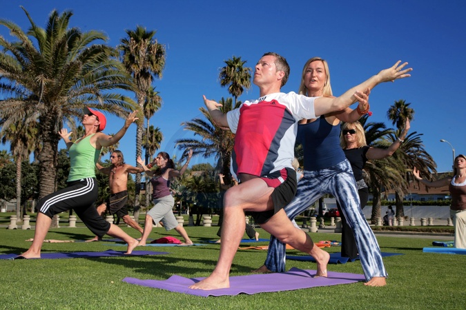 Marek Probosz z zona Malgorzata cwiczy joge. Malgosia prowadzi szkole jogi w Los Angeles