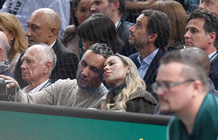 Keylor Navas, Andrea Salas - People dans les tribunes du Rolex Paris Bercy Masters 1000 remporté par Novak Djokovic contre Grigor Dimitrov , le 4 novembre 2023. © Veeren/Bestimage People in the stands of the Rolex Paris Bercy Masters 1000 won by Novak Djokovic against Grigor Dimitrov, November 4, 2023.