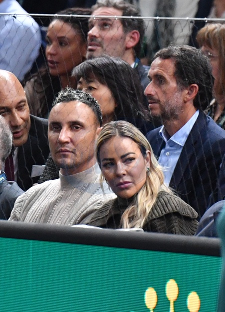 Keylor Navas et sa femme Andrea Salas, Alexandre Bompard - People dans les tribunes du Rolex Paris Bercy Masters 1000 remporté par Novak Djokovic contre Grigor Dimitrov , le 4 novembre 2023. © Veeren/Bestimage People in the stands of the Rolex Paris Bercy Masters 1000 won by Novak Djokovic against Grigor Dimitrov, November 4, 2023.