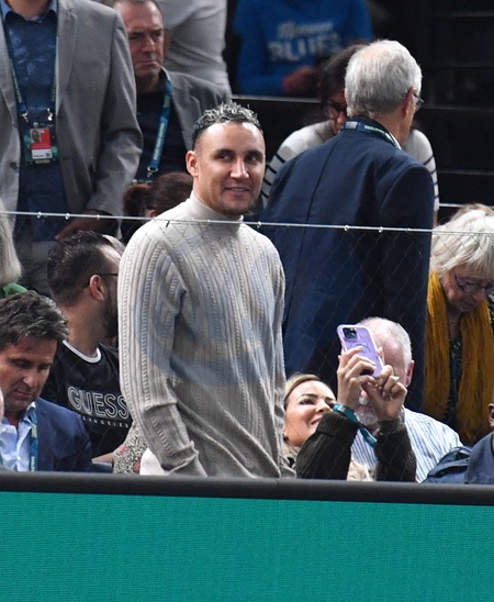 Keylor Navas et sa femme Andrea Salas - People dans les tribunes du Rolex Paris Bercy Masters 1000 remporté par Novak Djokovic contre Grigor Dimitrov , le 4 novembre 2023. © Veeren/Bestimage People in the stands of the Rolex Paris Bercy Masters 1000 won by Novak Djokovic against Grigor Dimitrov, November 4, 2023.