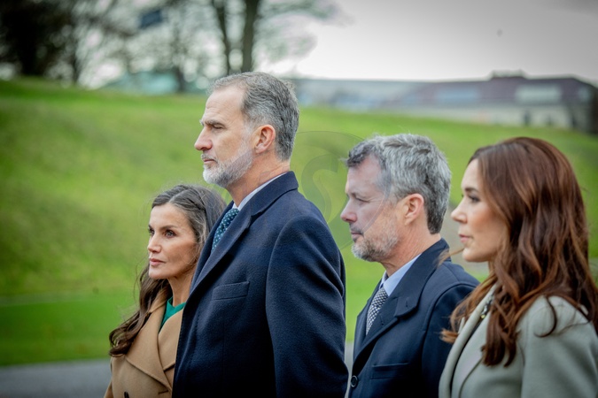 Le roi Felipe VI et la reine Letizia d'Espagne, Le prince Frederik et la princesse Mary de Danemark lors d'un dépôt de gerbes à la Citadelle à Copenhague, le 7 novembre 2023. State Visit of King Felipe and Queen Letizia of Spain to Denmark. Wreath laying, The Citadel by King Felipe and Queen Letizia of Spain acopannied by Crown Prince Frederik and Crown Princess Mary of Denmark. November 7th, 2023.