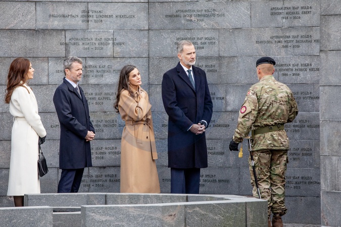 Le roi Felipe VI et la reine Letizia d'Espagne, Le prince Frederik et la princesse Mary de Danemark lors d'un dépôt de gerbes à la Citadelle à Copenhague, le 7 novembre 2023. State Visit of King Felipe and Queen Letizia of Spain to Denmark. Wreath laying, The Citadel by King Felipe and Queen Letizia of Spain acopannied by Crown Prince Frederik and Crown Princess Mary of Denmark. November 7th, 2023.