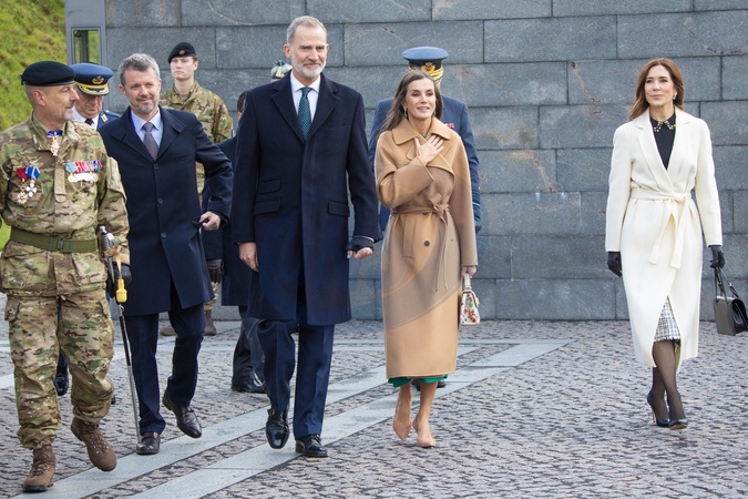 Le roi Felipe VI et la reine Letizia d'Espagne, Le prince Frederik et la princesse Mary de Danemark lors d'un dépôt de gerbes à la Citadelle à Copenhague, le 7 novembre 2023. State Visit of King Felipe and Queen Letizia of Spain to Denmark. Wreath laying, The Citadel by King Felipe and Queen Letizia of Spain acopannied by Crown Prince Frederik and Crown Princess Mary of Denmark. November 7th, 2023.