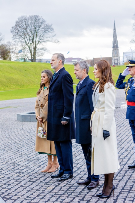 Le roi Felipe VI et la reine Letizia d'Espagne, Le prince Frederik et la princesse Mary de Danemark lors d'un dépôt de gerbes à la Citadelle à Copenhague, le 7 novembre 2023. State Visit of King Felipe and Queen Letizia of Spain to Denmark. Wreath laying, The Citadel by King Felipe and Queen Letizia of Spain acopannied by Crown Prince Frederik and Crown Princess Mary of Denmark. November 7th, 2023.