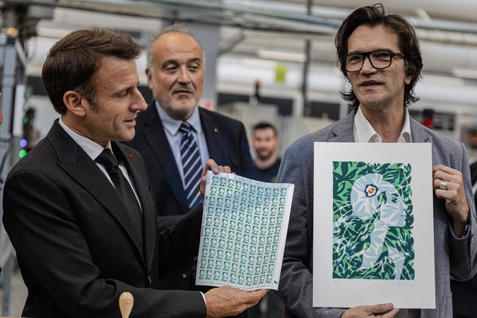 Prezydent Emmanuel Macron w drukarni znaczkow pocztowych