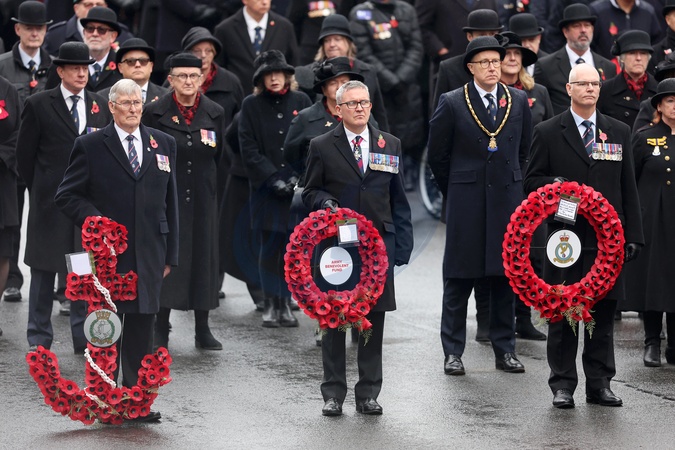 LONDON, ENGLAND - NOVEMBER 12: Veterans carrying wreaths during the National Service of Remembrance at The Cenotaph on November 12, 2023 in London, England. Every year, members of the British Royal family join politicians, veterans and members of the public to remember those who have died in combat., Credit:Chris Jackson / Avalon