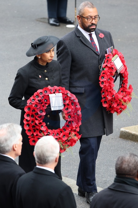 LONDON, ENGLAND - NOVEMBER 12: Suella Braverman MP and James Cleverly MP during the National Service of Remembrance at The Cenotaph on November 12, 2023 in London, England. Every year, members of the British Royal family join politicians, veterans and members of the public to remember those who have died in combat., Credit:Chris Jackson / Avalon