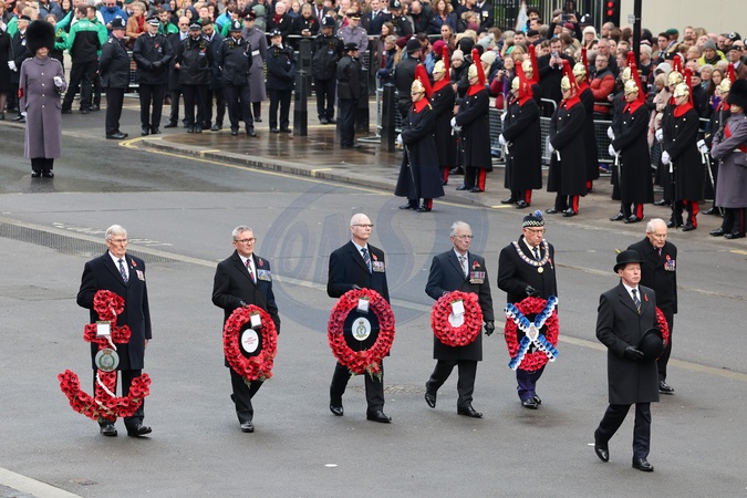 LONDON, ENGLAND - NOVEMBER 12: Veterans carrying wreaths during the National Service of Remembrance at The Cenotaph on November 12, 2023 in London, England. Every year, members of the British Royal family join politicians, veterans and members of the public to remember those who have died in combat., Credit:Chris Jackson / Avalon