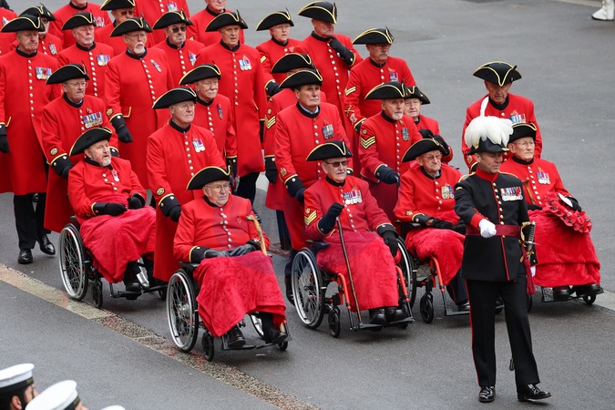LONDON, ENGLAND - NOVEMBER 12: Chelsea Pensioners during the National Service of Remembrance at The Cenotaph on November 12, 2023 in London, England. Every year, members of the British Royal family join politicians, veterans and members of the public to remember those who have died in combat., Credit:Chris Jackson / Avalon