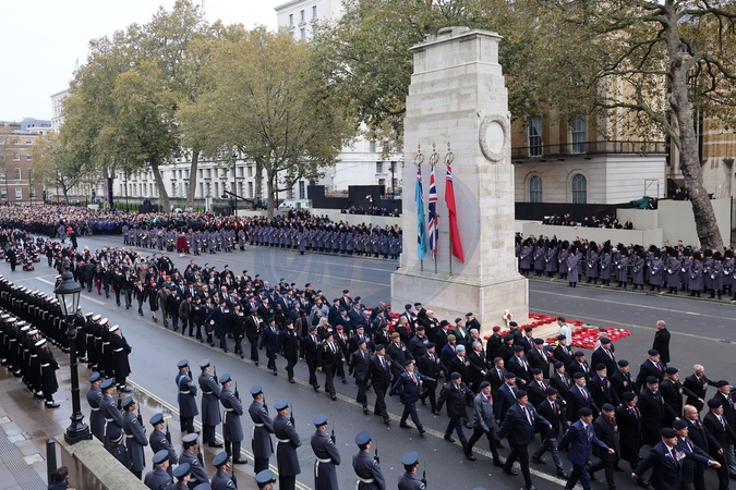 LONDON, ENGLAND - NOVEMBER 12: General view of the veteran parade during the National Service of Remembrance at The Cenotaph on November 12, 2023 in London, England. Every year, members of the British Royal family join politicians, veterans and members of the public to remember those who have died in combat., Credit:Chris Jackson / Avalon