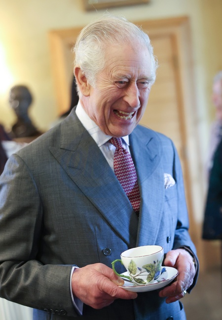 TETBURY, ENGLAND - NOVEMBER 13: King Charles III's shares a joke with a guest as he attends his 75th birthday party hosted by the Prince's Foundation at Highgrove House on November 13, 2023 in Tetbury, England. Guests include local residents who have been nominated by friends and family and individuals and organisations also turning 75 in 2023., Credit:Chris Jackson / Avalon