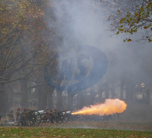London, UK. 14th Nov, 2023. The King's Troop Royal Horse Artillery fire a 41 Gun Royal Salute amidst Autumnal foliage at The Green Park to mark His Majesty The King's birthday with 71 horses pulling six First World War era 13-pounder Field Guns into position before the Gun Salute at noon as heavy rain falls., Credit:MALCOLM PARK / Avalon