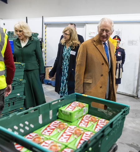 Krol Karol III i krolowa Camilla w magazynach Fare Share Didcot
