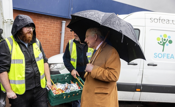 Krol Karol III i krolowa Camilla w magazynach Fare Share Didcot