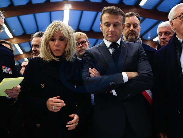 Le président français Emmanuel Macron arrive pour rencontrer les équipes de secours à Clairmarais, France, le 14 novembre 2023. Le président Macron et sa femme la Première Dame Brigitte, visitent des villes inondées près de Calais, dans le nord de la France, après une série de tempêtes et de fortes pluies qui ont forcé l'évacuation des écoles, des champs agricoles inondés et des services publics mis à rude épreuve. Macron veut montrer son soutien aux habitants et aux équipes de secours, Le président de la République française Emmanuel Macron annonce le classement de 244 communes en catastrophe naturelle dans le Nord et Pas-de-Calais France's President Emmanuel Macron , center right, and his wife Brigitte, center left, attend a meeting with rescue teams in Clairmarais, northern France, Tuesday, Nov. 14, 2023. President Macron and his wife, Brigitte, visit inundated towns near Calais in northern France after a series of storms and heavy rains forced school evacuations, flooded farm fields and strained public services. Macron wants to show his support to residents and rescue teams, the French presidency said.