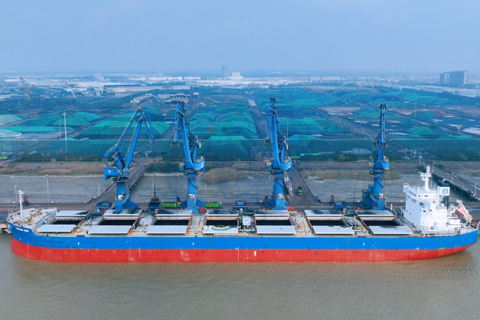 Cranes load coal imported from Australia onto trucks on a pier in Rugao city in east China's Jiangsu province Thursday, Nov. 16, 2023., Credit:WU SHUJIAN / Avalon