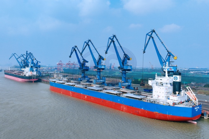 Cranes load coal imported from Australia onto trucks on a pier in Rugao city in east China's Jiangsu province Thursday, Nov. 16, 2023., Credit:WU SHUJIAN / Avalon