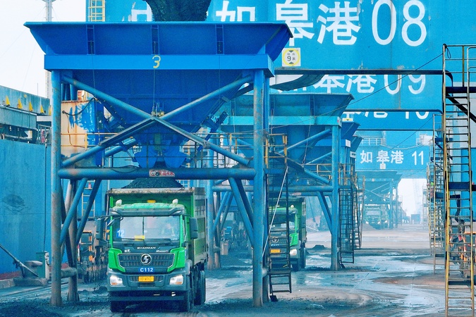 Trucks get loaded with coal imported from Australia on a pier in Rugao city in east China's Jiangsu province Thursday, Nov. 16, 2023., Credit:WU SHUJIAN / Avalon