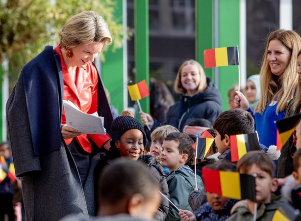 La reine Mathilde de Belgique visite l'école maternelle GVKS Groenendaal à Merksem en Belgique le 15 novembre 2023. 15-11-2023 Merksem Queen Mathilde visit the GVKS Groenendaal nursery school in Merksem, as part of the week of reading aloud, which takes place this year from November 18 to 26. She participates in a reading session aloud with children from the third kindergarten and allophone parents who take Dutch lessons at school. She then attended a discussion on this subject and on the importance of reading companions aloud. The week of reading aloud is an annual event of the ASBL "Iedereen Leest", which aims to promote reading out loud. This new edition is called "Do you want to be my reading companion aloud?". Photo: copyright :Royalportraits Europe/Bernard Ruebsamen