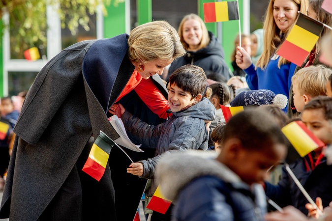 La reine Mathilde de Belgique visite l'école maternelle GVKS Groenendaal à Merksem en Belgique le 15 novembre 2023. 15-11-2023 Merksem Queen Mathilde visit the GVKS Groenendaal nursery school in Merksem, as part of the week of reading aloud, which takes place this year from November 18 to 26. She participates in a reading session aloud with children from the third kindergarten and allophone parents who take Dutch lessons at school. She then attended a discussion on this subject and on the importance of reading companions aloud. The week of reading aloud is an annual event of the ASBL "Iedereen Leest", which aims to promote reading out loud. This new edition is called "Do you want to be my reading companion aloud?". Photo: copyright :Royalportraits Europe/Bernard Ruebsamen