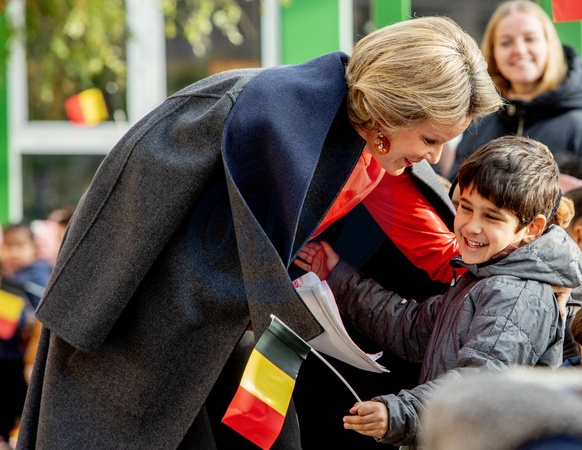 La reine Mathilde de Belgique visite l'école maternelle GVKS Groenendaal à Merksem en Belgique le 15 novembre 2023. 15-11-2023 Merksem Queen Mathilde visit the GVKS Groenendaal nursery school in Merksem, as part of the week of reading aloud, which takes place this year from November 18 to 26. She participates in a reading session aloud with children from the third kindergarten and allophone parents who take Dutch lessons at school. She then attended a discussion on this subject and on the importance of reading companions aloud. The week of reading aloud is an annual event of the ASBL "Iedereen Leest", which aims to promote reading out loud. This new edition is called "Do you want to be my reading companion aloud?". Photo: copyright :Royalportraits Europe/Bernard Ruebsamen