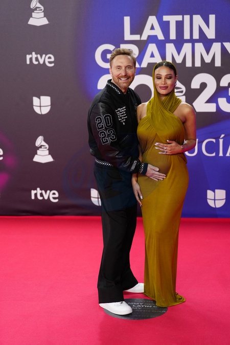 David Guetta et sa compagne Jessica Ledon, enceinte, lors du photocall de la cérémonie des "Latin Grammy Awards 2023" à Séville, le 16 novembre 2023. David Guetta and his pregnant girlfriend Jessica Ledon - 24th Annual Latin GRAMMY Awards Red Carpet at FIBES on November 16, 2023 in Seville, Spain