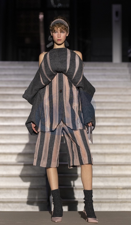 London, UK. 17th Nov, 2023. Fashion in Motion: Inspired by Gabrielle Chanel. To coincide with the exhibition Gabrielle Chanel. Fashion Manifesto, 2nd year students at Central Saint Martins BA Fashion Design Womenswear course showcase a unique selection of outfits created in response to one of the 20th century's most influential designers. 22 designs are presented in a series of catwalks set against the backdrop of the V&A's iconic Raphael Gallery., Credit:MALCOLM PARK / Avalon