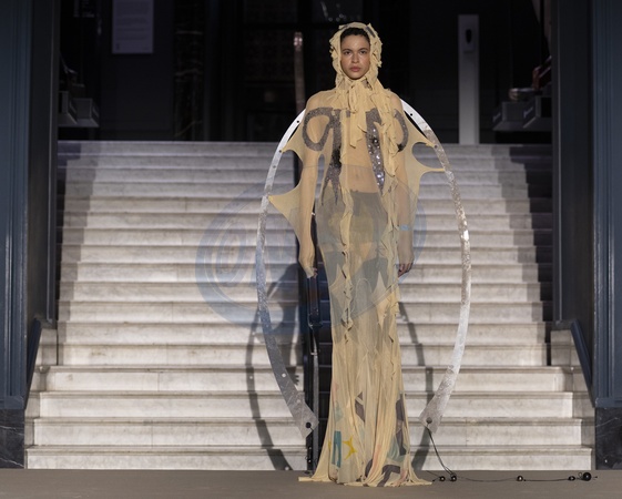 London, UK. 17th Nov, 2023. Fashion in Motion: Inspired by Gabrielle Chanel. To coincide with the exhibition Gabrielle Chanel. Fashion Manifesto, 2nd year students at Central Saint Martins BA Fashion Design Womenswear course showcase a unique selection of outfits created in response to one of the 20th century's most influential designers. 22 designs are presented in a series of catwalks set against the backdrop of the V&A's iconic Raphael Gallery., Credit:MALCOLM PARK / Avalon