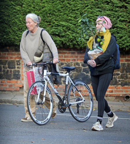 ***EXCLUSIVE ALLROUNDER***NO UK SALES***Hollywood actor, Dame Emma Thompson DBE, 64, cuts a casual figure in a beige sweater as she enjoys an afternoon outing with her daughter, Gaia Wise, 23. They were seen deep in conversation as they strolled through London's affluent Hampstead area. The 'Harry Potter' and 'Nanny McPhee' star was seen pushing her bicycle alongside Gaia who was carrying what appeared to be a small lemon tree. London, UK, 18 November 2023***Must credit as: Avalon.Red***, Credit:Avalon.Red / Avalon