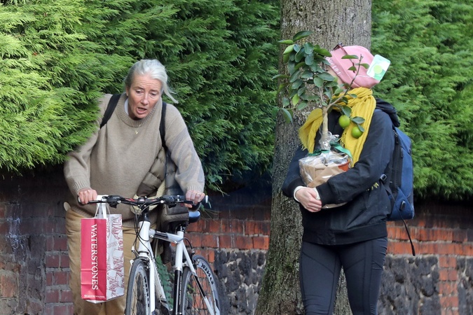 ***EXCLUSIVE ALLROUNDER***NO UK SALES***Hollywood actor, Dame Emma Thompson DBE, 64, cuts a casual figure in a beige sweater as she enjoys an afternoon outing with her daughter, Gaia Wise, 23. They were seen deep in conversation as they strolled through London's affluent Hampstead area. The 'Harry Potter' and 'Nanny McPhee' star was seen pushing her bicycle alongside Gaia who was carrying what appeared to be a small lemon tree. London, UK, 18 November 2023***Must credit as: Avalon.Red***, Credit:Avalon.Red / Avalon