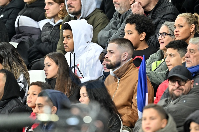 Les membres de la famille de Warren Zaïre-Emery durant la match de football de phase de groupes de l'Euro 2024, France contre Gibraltar, à l'Allianz Riviera à Nice, le 18 novembre 2023. Déjà qualifiée pour l'Euro-2024,la France a battu Gibraltar 14 à 0. C'est la plus large victoire de l'histoire des Bleus. Ils se sont imposés grâce notamment à un triplé de Kylian Mbappé et des doublés de Kingsley Coman et Olivier Giroud. Warren Zaïre-Emery, qui afait ses grands débuts en Bleu à 17 ans, 8 mois et 10 jours, le plus jeune joueur à revêtir le maillot bleu depuis 1911, a été l'auteur du 3eme but.Le milieu de terrain n'a profité qu'un quart d'heure de sa première sélection en équipe de France, à 17 ans, ayant été contraint de sortir prématurément, blessé à la cheville juste après avoir marqué son premier but avec les Bleus. © Bruno Bebert / Bestimage Already qualified for Euro-2024, France beat Gibraltar 14 to 0. It is the largest victory in the history of the Bleus. They won thanks in particular to a hat-trick from Kylian Mbappé and doubles from Kingsley Coman and Olivier Giroud. Warren Zaire-Emery, who made his debut in the team of France at 17 years, 8 months and 10 days, the youngest player to wear the blue jersey since 1911, was the author of the 3rd goal. The midfielder only enjoyed a quarter of an hour of his first selection for the French team, at 17, having been forced to leave prematurely, injured in the ankle just after scoring his first goal with this team.